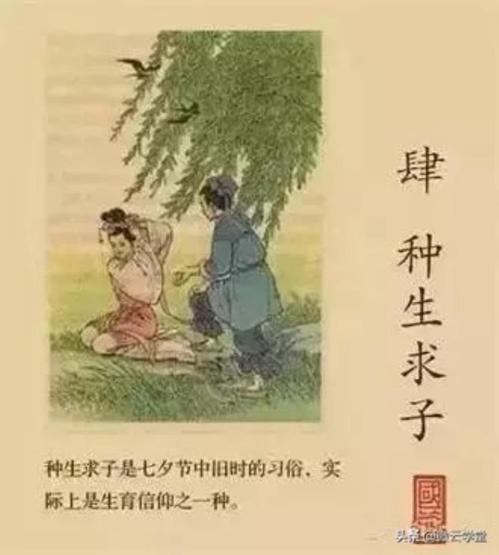 种生求子:旧时习俗,在七夕前几天,先在小木板上敷一层土,播下粟米的种子,让它生出绿油油的嫩苗,再摆一些小茅屋、花木在上面,做成田舍人家小村落的模样,称为“壳板”,或将绿豆、小豆、小麦等浸于磁碗中,等它长出敷寸的芽,再以红、蓝丝绳扎成一束,称为“种生”,又叫“五生盆”或“生花盆”。南方各地也称为“泡巧”,将长出的豆芽称为巧芽,甚至以巧芽取代针,抛在水面乞巧。还用蜡塑各种形象,如牛郎、织女故事中的人物,或秃鹰、鸳鸯、等动物之形,放在水上浮游,称之为“水上浮”。又有蜡制的婴儿玩偶,让妇女买回家浮于水土,以为宜子之祥,称为“化生”。