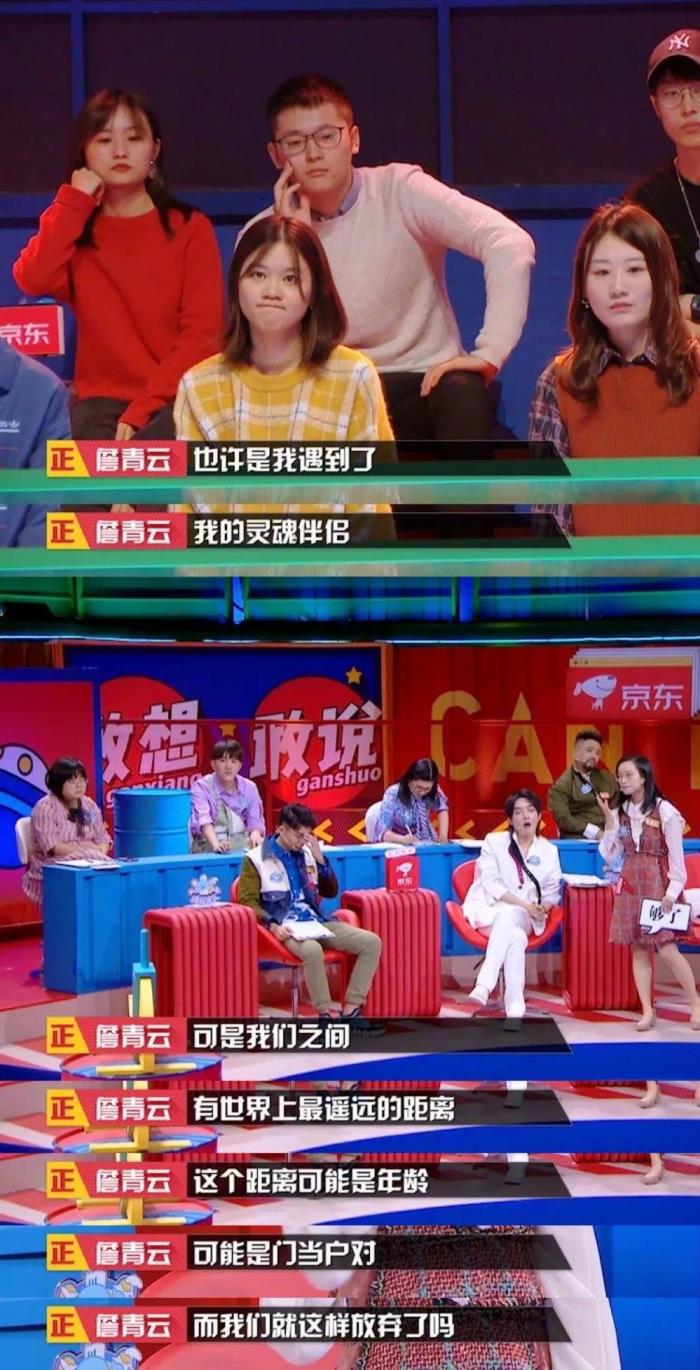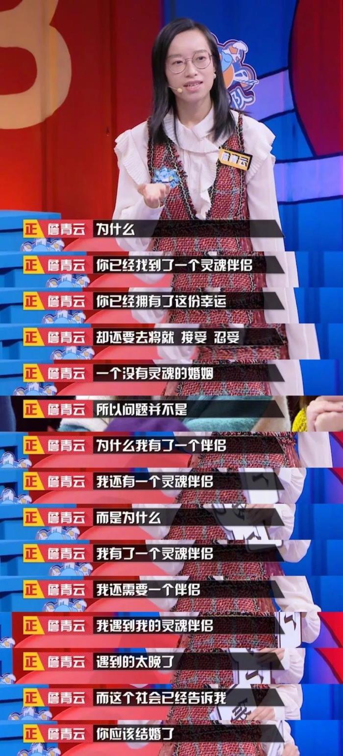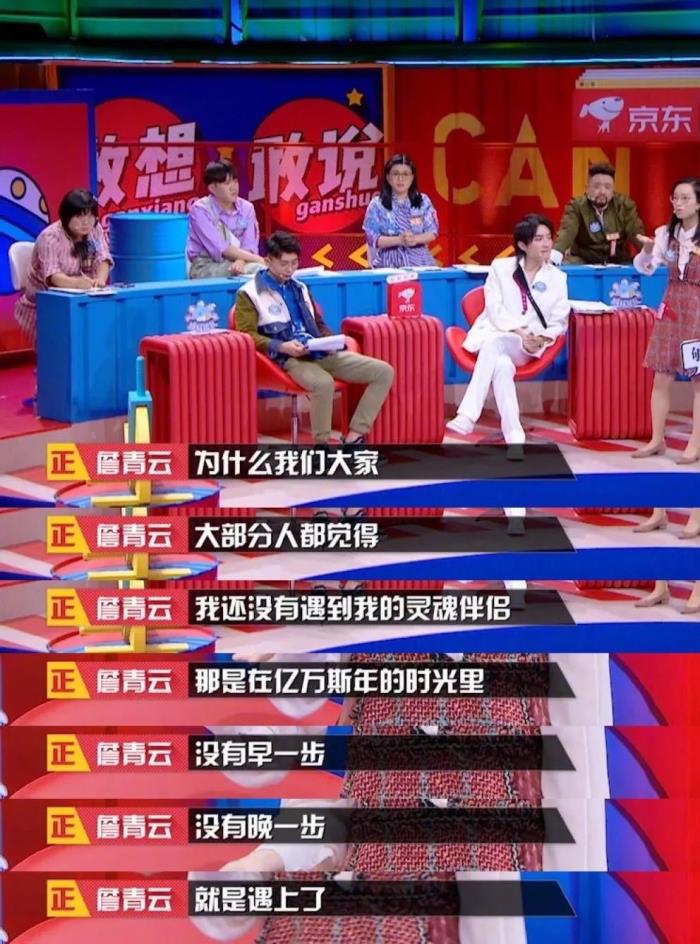 她的观点不是建议“灵魂伴侣”的存在,而是“你为什么有了一个伴侣还需要一个灵魂伴侣呐?”,“我介意的是这个世界不允许他去拥抱,他自己的灵魂伴侣却拥抱了,灵魂并不属于他的我”,说实话很击中人心,三人的爱情枷锁彼此疲倦,每一个人的“占有欲”都很强,爱情的共享谁可以那么无私?这次詹青云更是把自己的感情生活拿出来,自己的前任男友同样是个高材生,麻省理工物理博士,詹青云自己表示,两个人的分开不是说家庭问题,学历问题,两个人各方面都很配,而在于精神层面,詹青云自己有事情不愿与男友分享觉得在认知上没法得到共识,在灵魂上并没有成为伴侣两人最终还是分开无疾而终,而此时对面储教授打出“相濡以沫”一词把生活阅历放出来击败了詹青云,储教授的观点更多是“妥协”,其实对于生活也是更多的是无奈的迫于接受居多,不少网友直言:詹青云也是输在生活阅历,毕竟詹青云还是90后。
