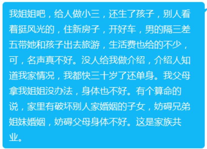 说起来我的婚姻都是一把泪。我是抢了别人的老公,觉得他事业有成,长相也不错,趁他老婆生孩子没多久,双方没啥夫妻生活,挑唆他们夫妻离婚了。和他结婚以后,就出现了小四、小五,他本性风流,用情不专,没啥责任心,其实想想也是,孩子还没满一岁他就能残忍抛弃前妻和孩子,我怎么可能就是他最后一个呢?婚后的眼泪是婚前脑子里进的水,人前我还要装作开开心心,过得很幸福的样子,其实很多时候,都是我一个人在家,他经常夜不归宿的。