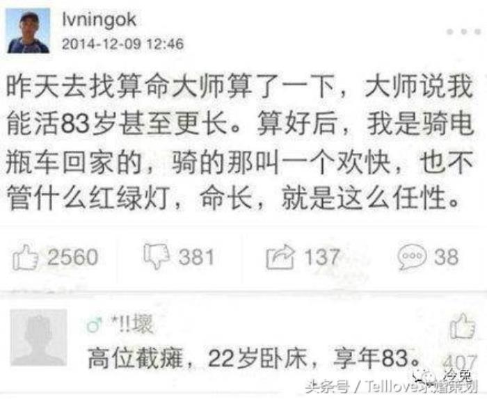 街上散步,看见一年轻乞丐跪在地上乞讨,我感叹道:“你有手有脚,为什么要跪着不去干点别的?”他微微一笑说:“自己选择的路,跪着也要走完。”