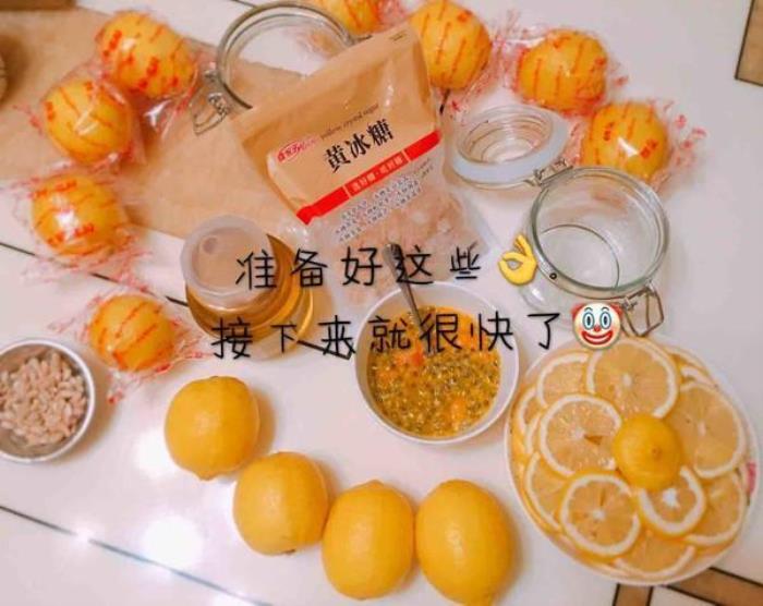 柠檬 4个、百香果 3个、蜂蜜 1罐、黄糖 200克