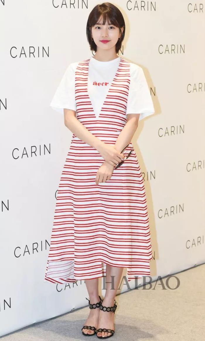 裴秀智身着Aeer字母印花白T恤搭配同品牌条纹裙与Premiata凉鞋现身品牌活动