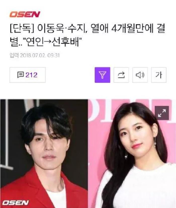 据韩媒报道裴秀智与李栋旭恋爱4个月后,宣布近期分手,对此双方所属社表示因为行程非常繁忙,见面比较困难,自然而然地分手了。