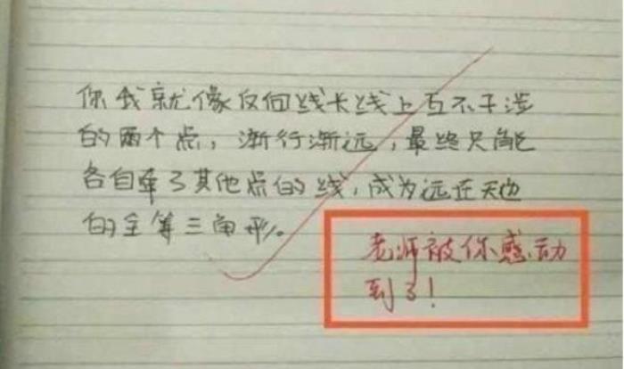 数学老师在看了之后,也是无奈的笑了,毕竟早恋是不好的,所以老师也没有告诉这位同学答案,但是老师在书信下面写下了:“被你感动到了!”随后还把这封“委婉情书”拍了下来上传到了网上。