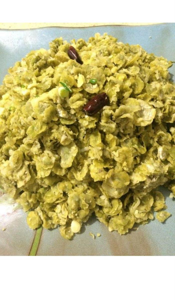 九成榆钱儿搅合一成玉米面,上屉锅里蒸,水一开花就算熟,只添一灶柴火就够火候儿。然后,盛进碗里,把切碎的碧绿白嫩的青葱,泡上隔年的老腌汤,拌在榆钱饭里,吃着很顺口,也能哄饱肚皮。