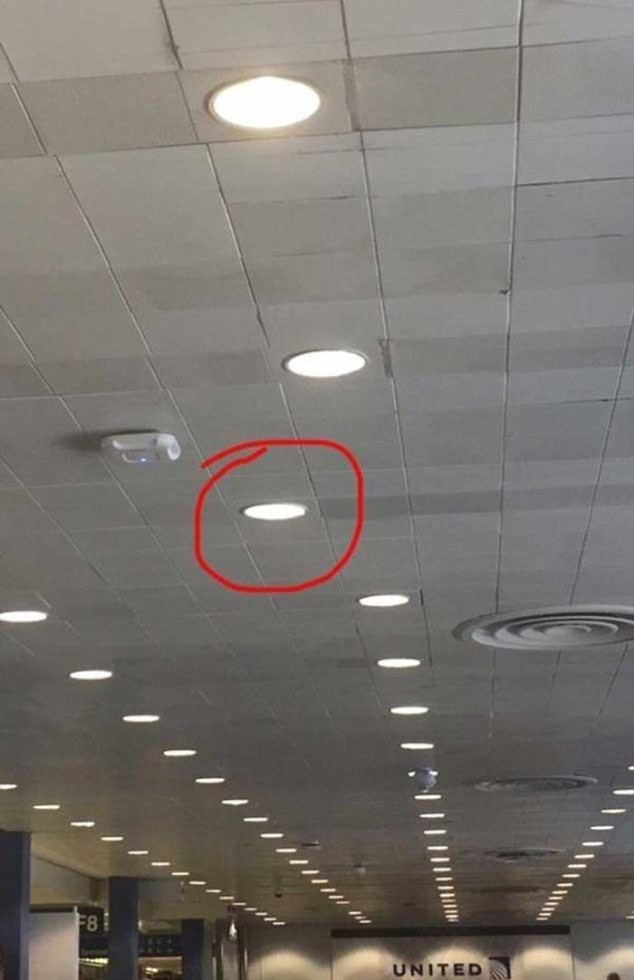 在一排有规律分布的顶灯中有一盏灯出现在了队伍之外。