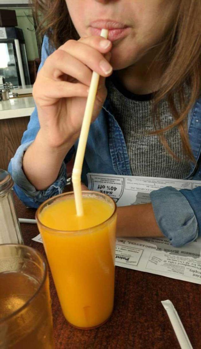 一名喝果汁的女士,但她插反了吸管。