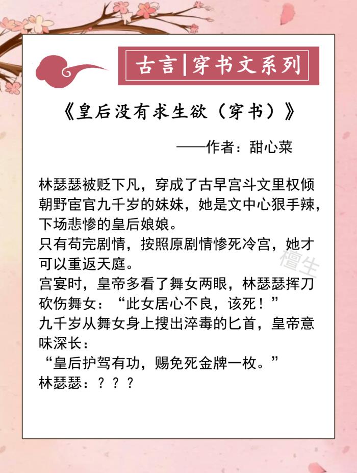 简评:女主林瑟瑟被贬下凡轮回七世,好在司命星君护她,让她代替恶毒女配走剧情,就算作一世轮回完成。女主穿越成宫斗文里心狠手辣、不得善终的皇后,作为终级大BOSS,女主还有个很强硬的靠山——宦官九千岁。为了能顺利将剧情走完,也为了不提前被人暗杀,女主决定倚仗九千岁的势力,帮自己揪出幕后黑手度过难关。而她不知道的是,她每一次靠近,都让这位权势薰天的九千岁面红耳赤、心乱成麻。原来九千岁是来人间历情劫的文昌帝君,他暗恋她几万年……
