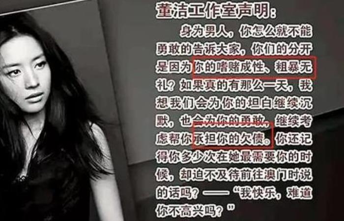 对于离婚原因,董洁工作室直言不讳的指责潘粤明,说他嗜赌成性、粗暴无礼,还欠下一屁股债。