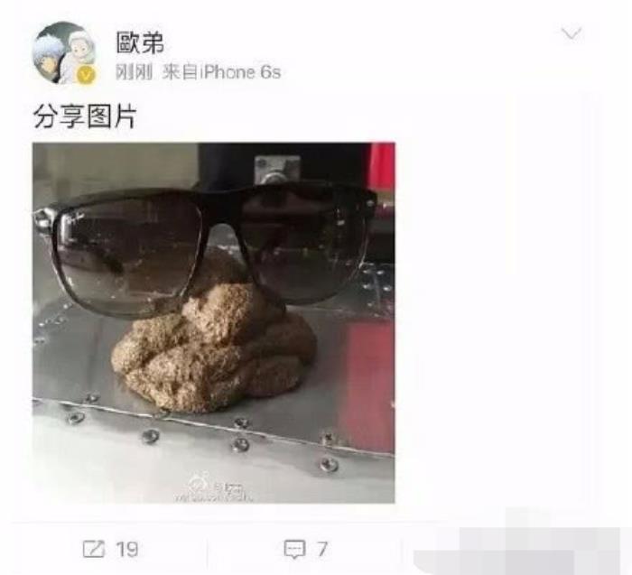 之后就传出欧弟和涵哥闹翻的消息,先是欧弟发了一张一坨屎+一副黑色眼镜的配图,随后秒删,此举被指是骂汪涵是屎。
