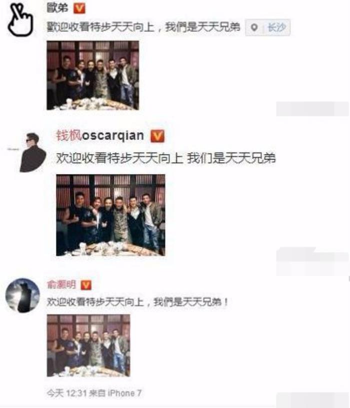 不过,后来两人冰释前嫌,去年7月天天兄弟就私下聚过一次,欧弟、钱枫和俞灏明还同一时间发了微博,表明兄弟情谊不变。