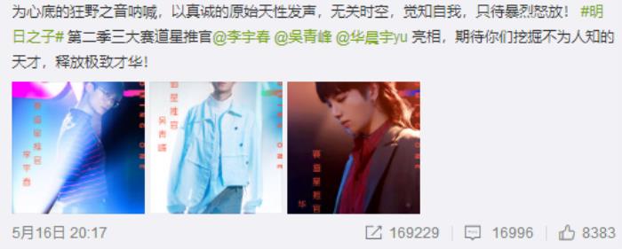 去年综艺选秀《明日之子》热度满满,毛不易也成功由护士转为歌手,并问鼎冠军,他的《消愁》上线播放量即破亿,吸引了众多的关注。近日,等待许久的《明日之子》第二季终于开录,明星阵容也随之曝光,李宇春、吴青峰、华晨宇担当本季三大赛道的星推官,还有现场总导演何炅,厂牌星推官杨幂,有了这些他们的加盟,网友们也对第二季的充满了期待,也不忘调侃:“李宇春话少,华晨宇话少,吴青峰话少,想象下氛围,很好笑” “这次预测要有选手哭了,一个个不调节,气氛靠何老师了!” 哈哈哈哈,你们真是够了。