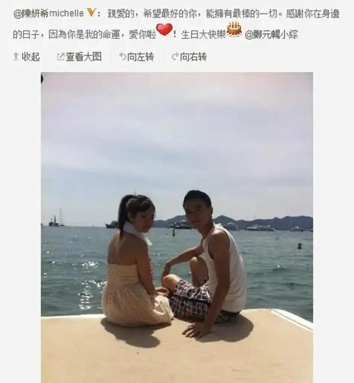 那年,郑元畅生日,陈妍希发微博称:"你是我的命运,爱你啦!"