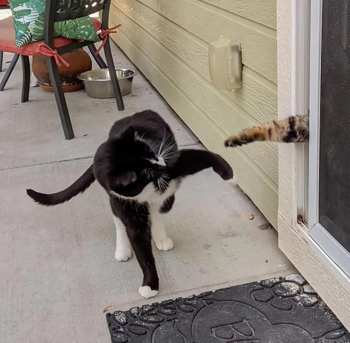 去年年底,这只奶牛猫的家人搬到了我们附近,它每天都喜欢透过玻璃门看我们。它会非常耐心等待我家的两只猫咪出门,有时候我的猫还会打开纱窗门邀请它进来。
