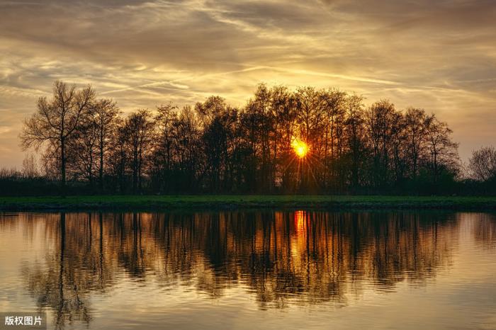 唐·白居易《湖亭望水》红:指夕阳殷红色的霞光。绿:指碧绿的湖水。色彩对照明艳,这是一幅黄昏时日落风定,以静取胜的画面。