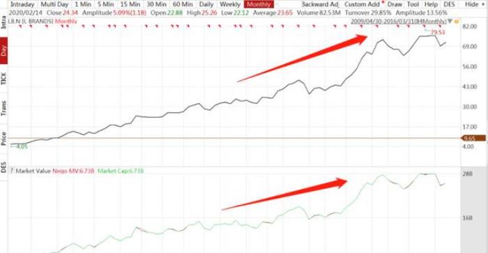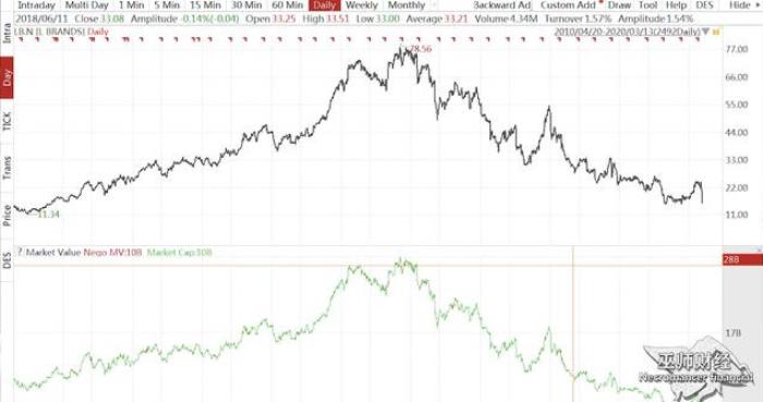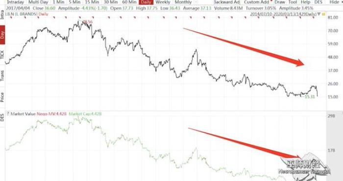 资本市场也做出了自己的选择,L Brands股价从2016年起就进入下行通道,还是上边儿股价下边儿市值啊,股价从当年的70多刀跌到了现在的十几刀,而估值也从28个billion跌到了现在的4个billion