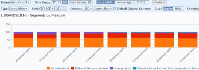 且维密板块收入占据L Brands的大头,每年都超过60%,就是其中的橙色部分,也就是说在众多品牌中,维密给L Brands的贡献超过一半以上