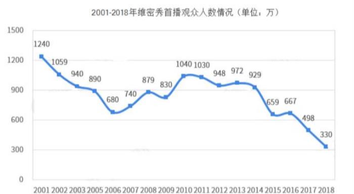 而维密大秀也迎来了反转,根据尼尔森的数据,2012年至2014年,收视数据基本在900多万。而2015年开始断崖式下跌,降至659万, 2017年,也就是来上海办的那次,继续降至498万,2018年则降至历史最低的330万,2019年维密大秀宣布停办
