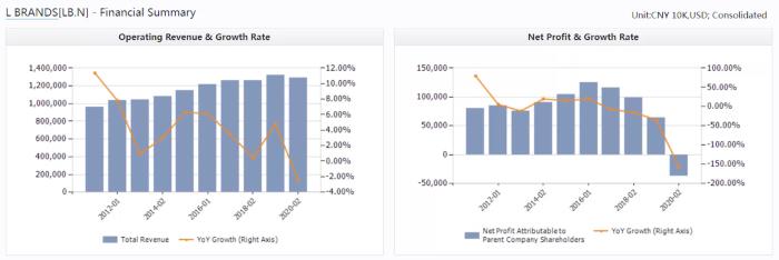 然而该来的总是要来,最终的负面效应反馈在数据和财报上,2018年维密在美国的市场份额从2013年的31.7%下降至24%,再看财务数据,其扣非后净利润从16年就出现负增长,然后一路加速向下,16和17年都是10亿上下,18年就只有7.4亿了,而去年更惨只有3.5亿,这是扣非后的数据,但如果不扣非,去年就不是3.5亿了,而是亏损3.7亿,这儿降维一下,所谓扣非后净利润,就是扣除非经常性损益后的净利,衡量一家公司的赚钱能力,得扣掉不可持续和与主营业务不直接相关的损益,看你凭自己真本事赚了多少钱,比如某企业把公司大楼卖了200亿,还获得了政府补贴33亿,这233亿就不可持续或者和主营业务不相关,不能算进盈利能力,另一方面,如果公司的厂房因为地震塌了,这种损失也不能算进盈利能力,还有税收减免、计提的资产减值准备等都在非经常性损益之列,而L brands 19年的非经常性损益就是负的7个多亿,官方原文也说了,这7个多亿是维密商誉和门店相关的减值,害,又是商誉,不愿意去研究其中猫腻的同学只要记住结论:L brands的整体财务数据以肉眼可见的速度在恶化