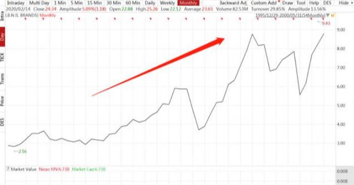 其实维密从诞生之初到初具规模,一直被各种批评,甚至可以说是在祖安区被骂大的,但每出现一次这样的争议,维密反而引来更多流量,带动销量猛增,随之而来的也是母公司L brands的股价水涨船高,市值也持续膨胀,看这张图,自1995年到2000年,其股价从3块多涨到了8块多刀,翻了一倍还多
