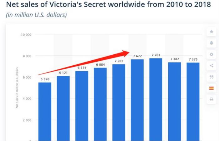 这一切的歌舞升平,终于在2016年开始出现逆转,维密全球销售额开始出现负增长,也就是2017年那一列,这儿虽然下降不多,但成为了重要的转折点,而2018的全球销售额较2017年还算凑合,基本持平,好像看不出什么下滑趋势