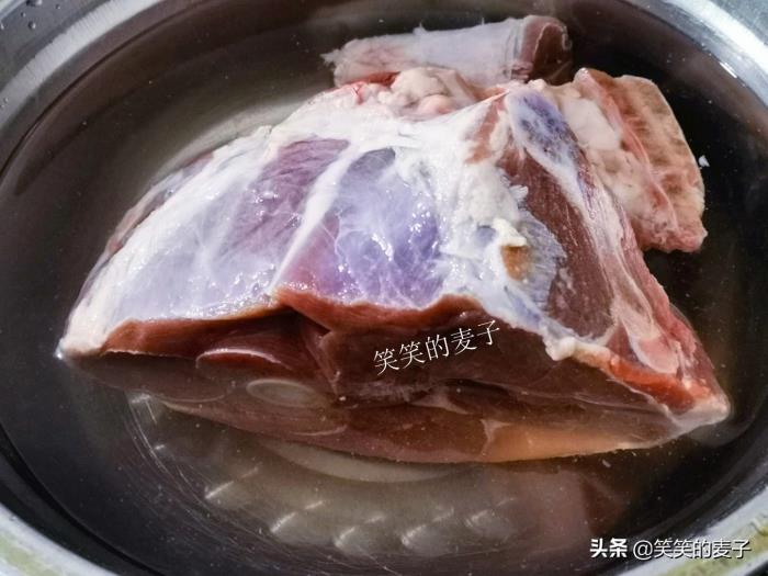 羊后腿浸泡15分钟后,剁成块,洗去血水。我这里没有给羊肉焯水,羊肉焯水有一部分原因是去掉膻味,但我觉得它的鲜味也会随之流失一部分,所以我是在汤炖煮开了后慢慢撇掉浮沫的。
