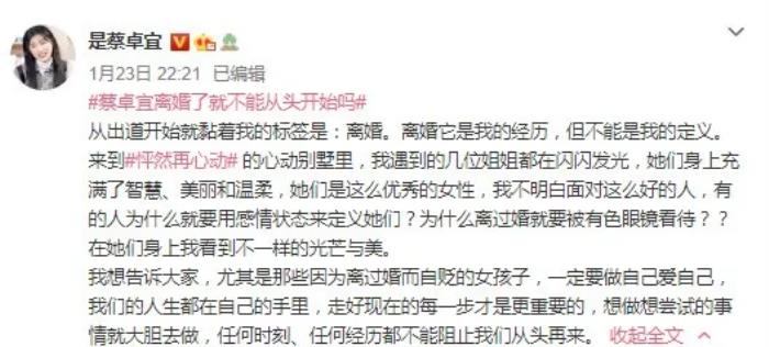 “离婚它是我的经历,但不能是我的定义。我想告诉大家,尤其是那些因为离过婚而自贬的女孩子,一定要做自己爱自己,我们的人生都在自己的手里,走好现在的每一步才是更重要的,想做想尝试的事情就大胆去做,任何时刻、任何经历都不能阻止我们从头再来。”