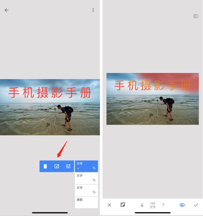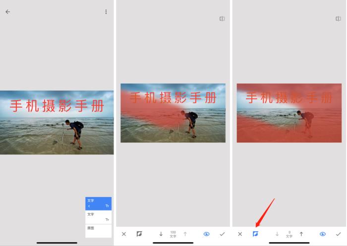 再次点击最上面的“文字”图层,点击画笔图标,用手指在照片中的文字右上部分做一个涂抹,点击“√”确定。这个渐变的效果就看出来了。