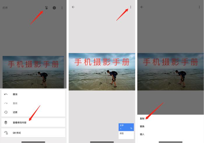 点击右上角带箭头的图标,点击“查看修改内容”,点击右上角三个圆点,点击“复制”。