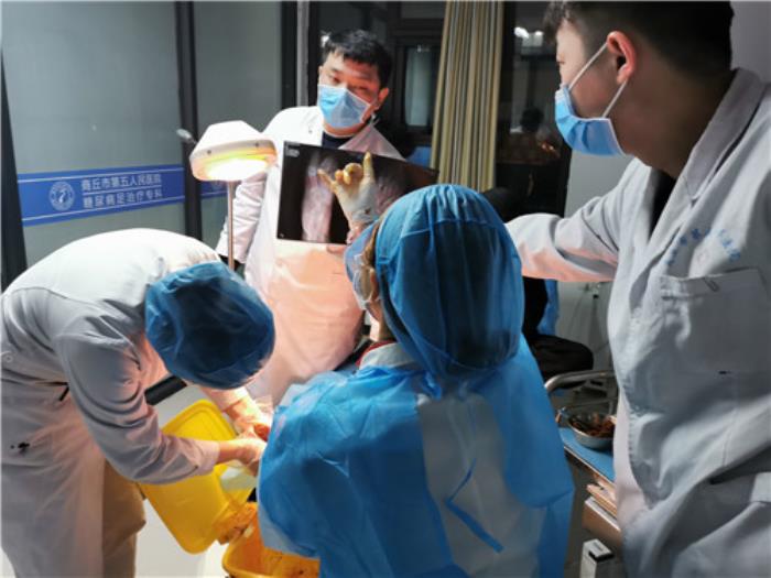 图 这是一位来自河北廊坊的徐老足溃疡患者,足部肿胀溃烂,袁主任正在为其足底部进行清创及切开引流