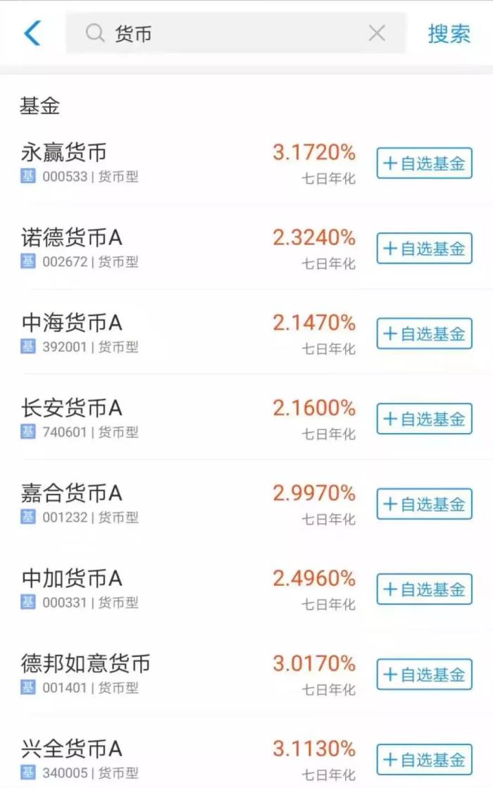 比如你在支付宝的基金版块搜索“货币”,就可以找到一长串的货币基金,财妈只截取其中一部分: