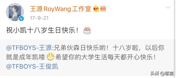 王源一向是一个很有团魂的人,是个小天使,不管什么时候都把组合和两个兄弟放在眼里的, 现在三个人长大了,有了自己的工作,在镜头面前难免会比较注意,团队为了让三个人解绑,平时除了组合的工作外,他们三个几乎没有任何的联系,三个人从小长大的关系还是如初,只不过一些事情没有粉丝们想象地那么简单了,比如三个人过生日,成立工作室之后,王俊凯是第一个过生日的人,只有王源工作室给小凯发了祝福,一发就是两年。