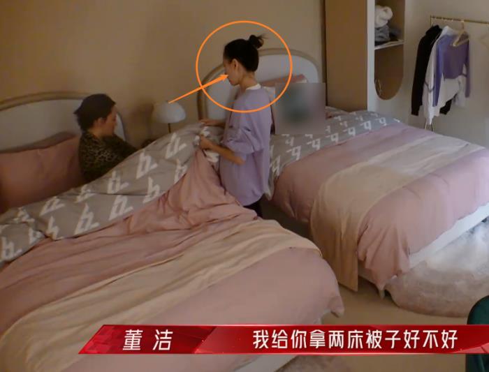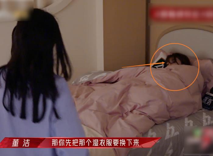 在董洁上前查看张馨予的状态时还不忘叮嘱她先把身上湿的衣服换下,并且董洁还担心张馨予会冷,还特意从隔壁房间抱多了一床被子过去,很细心的帮张馨予铺被子盖好。