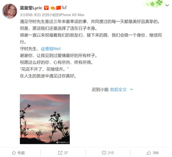 随后蓝盈莹在分手声明中回复说:“遇见守时先生是这三年来最幸运的事,共同度过的每一天都是美好且真挚的。但是,原谅我们还是选择了活在日子本身……接下来的路,我们会换一个身份,继续同行。守时先生,谢谢你,让我见到过爱情最好的所有样子。祝愿这么好的你,心有所向,终有所得。”