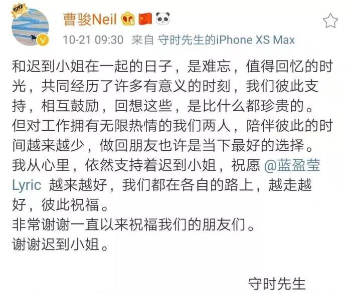 曹俊在分手声明中说:“和迟到小姐在一起的日子,是难忘、值得回忆的时光,共同经历了许多有意义的时刻,我们彼此支持,相互鼓励,回想这些比什么都珍贵……我从心里,依然支持着迟到小姐,祝愿@蓝盈莹越来越好,我们都在各自的路上,越走越好,彼此祝福。”
