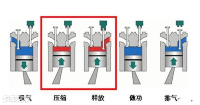正常来讲在做功冲程时,发动机进、排气门都应处于关闭状态,被压缩的气体将推动活塞向下形成驱动力。但当开启压缩释放式发动机制动后,排气门在进入做工冲程之前就已经处于打开状态,使压缩气体排出,防止活塞反弹。