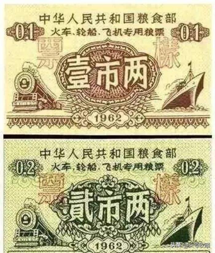1962年版火车轮船飞机专用粮票,全套2枚,面额分别为1市两(新制一斤等于十两,下同)、2市两。此套粮票发行不久后停止使用,存世量十分稀少。市场参考价为每套1万元至1.2万元。