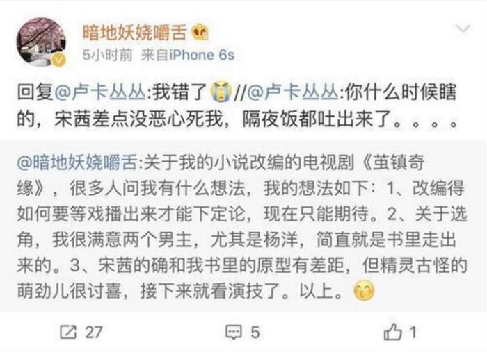之前,《茧镇奇缘》的作者也忍不住在微博中吐槽宋茜的演技,着实辣眼睛。