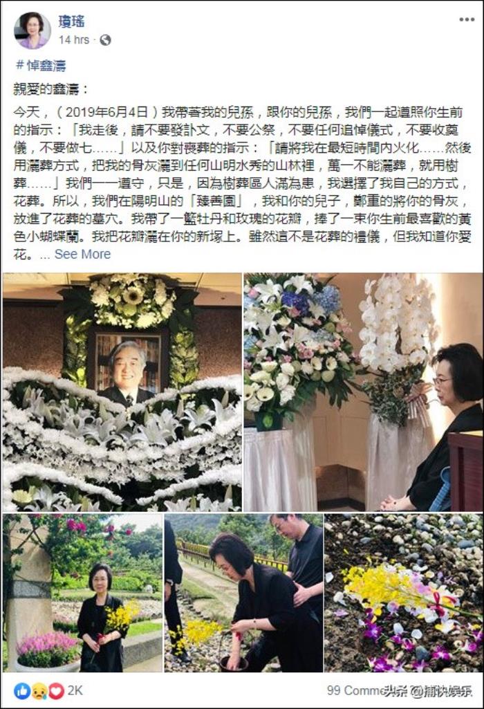 2019年5月23日,92岁的平鑫涛因病逝世,6月4日,琼瑶在网上发长文悼念丈夫:“鑫涛,你解脱了!我,也放下了。”但就在两年前,琼瑶还因为是否替平鑫涛插鼻胃管的事,和他的三个子女闹的不可开交,尽管平鑫涛生前曾希望将骨灰洒在山林里,但琼瑶还是帮丈夫选了“花葬”,她和平鑫涛的儿子将他的骨灰放在了阳明山的花葬墓穴里,并在其墓塚上,洒上了丈夫生前最爱的小蝴蝶兰。