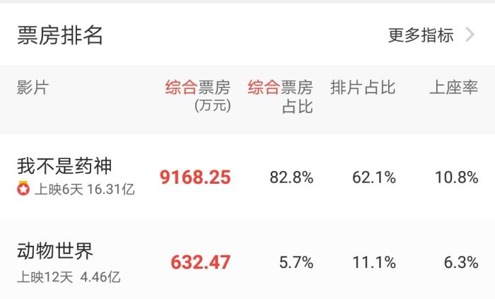 同档期内的电影《我不是药神》,上映6天的总票房已经突破了16亿元,相比来说,《动物世界》是比较低了。并且,目前《动物世界》的单日票房已不足《我不是药神》的十分之一。