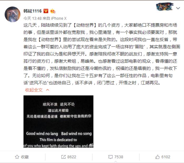 电影票房12天4.4亿,《动物世界》的导演韩延也公开发声了,他发微博称,“我在《动物世界》里的尝试目前看起来是失败的”,并且表示自己“自以为是和异想天开”,称自己将会“闭门思过,开悟之时,江湖再见”。