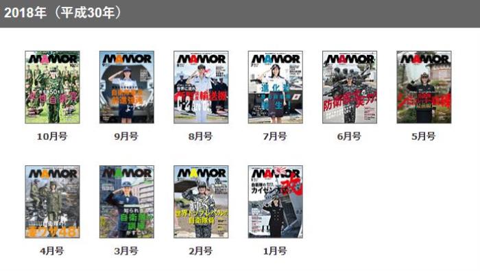 《MAMOR》杂志由日本自卫队与扶桑社联合发行,特点异常鲜明:请娱乐明星穿上自卫队制服、担任每期封面女郎,姿势只有一个:军礼。