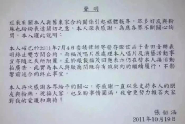 2011年,张韶涵和老东家福茂公司解约。