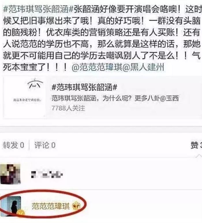 张韶涵举办演唱会宣传期,范玮琪一边点赞骂张韶涵的微博。