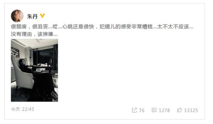 12月3日,在某活动上,朱丹对着嘉宾林允就喊了声“允儿”,对着古力娜扎喊迪丽热巴。12月3日晚,朱丹发文就口误道歉,称:“没有任何理由,今天诚挚地向古力娜扎,迪丽热巴,林允道歉,请原谅我的粗心,对于一个专业主持人这是万万不允许的。朱丹说,希望自己的粗心不会影响她们的美好心情。随后,她再发文,“很颓废,很沮丧…哎…心跳还是很快,犯错儿的感受非常糟糕…太不太不应该…没有理由,该挨揍…”