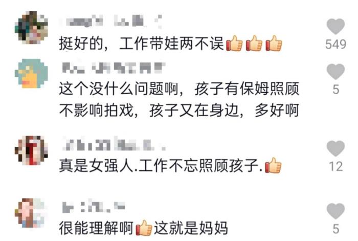 网友纷纷表示“这就是妈妈,很能理解”,还有人说到“工作带娃两不误”“工作不忘照顾孩子”,更是有网友说“孩子有保姆照顾不影响拍戏,孩子又在身边,多好”。