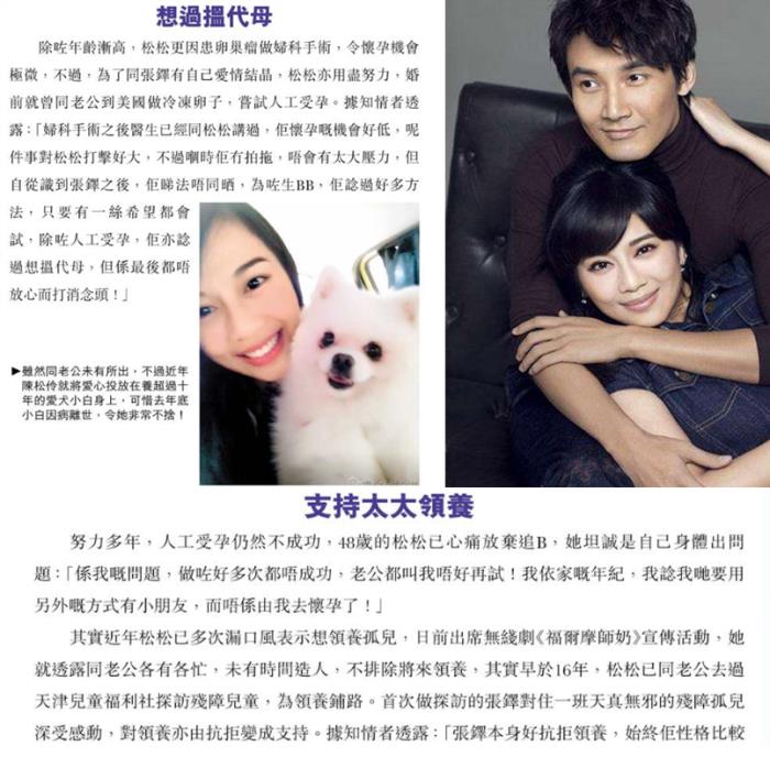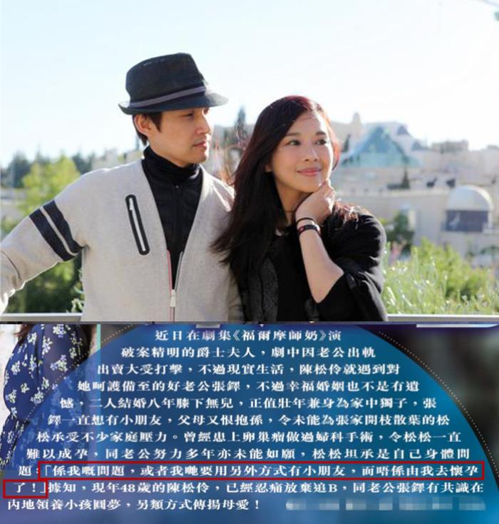 3月29日,据港媒报道,今年已经48岁的港星陈松伶放弃生子的计划,和老公张铎已经达成共识会在孤儿院领养代替生养,而不能生育的原因据港媒报道是因为多年前做的妇科手术,这可能成为她的终身遗憾。