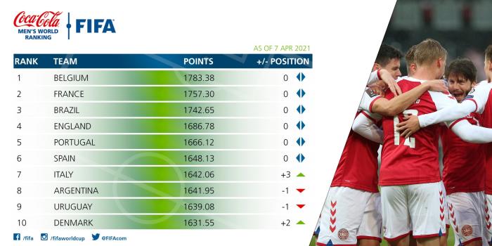 直播吧4月7日讯 国际足联最新国家队世界排名公布,比利时、法国、巴西依然分列前三,丹麦进前十,意大利上升三位来到第七,德国依然无缘前十(上期第13)。