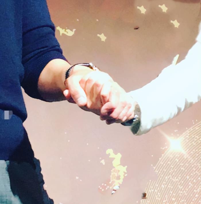 照片中,霍建华穿着深色上衣,林心如穿着白色外套,两人十指紧扣,似乎还戴着情侣手表。林心如在照片上加了一个闪光点缀,整个画面显得非常唯美。