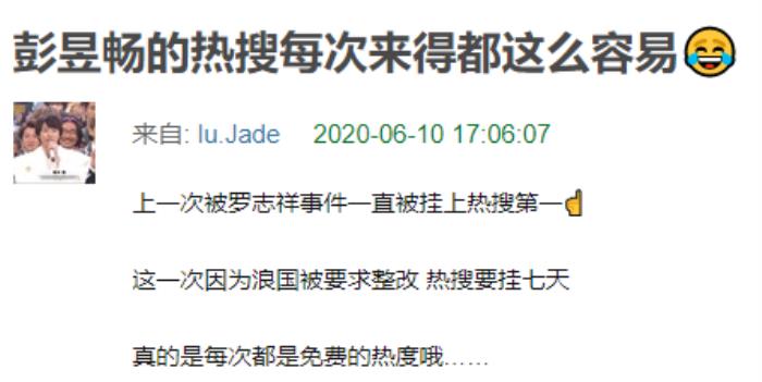 也就是说,刚好在6月10号那天,上了热搜榜的热搜们就会一直挂在上面,连挂七天。当然也包括#彭昱畅女友#这条咯。
